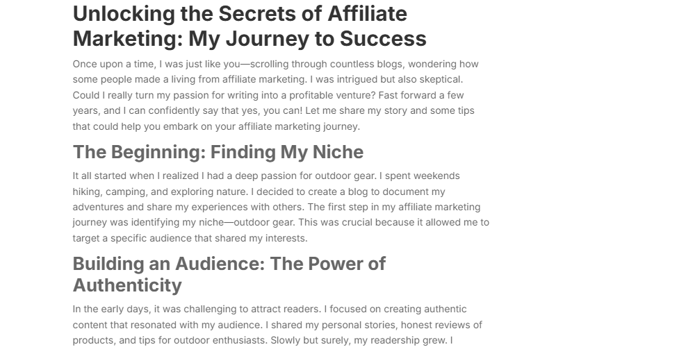 In the early days, it was challenging to attract readers. I focused on creating authentic content that resonated with my audience. I shared my personal stories, honest reviews of products, and tips for outdoor enthusiasts. Slowly but surely, my readership grew. I realized that authenticity was key; readers could sense when I was genuine, and they appreciated my honesty. This trust led to higher conversion rates when I started incorporating affiliate links into my posts.